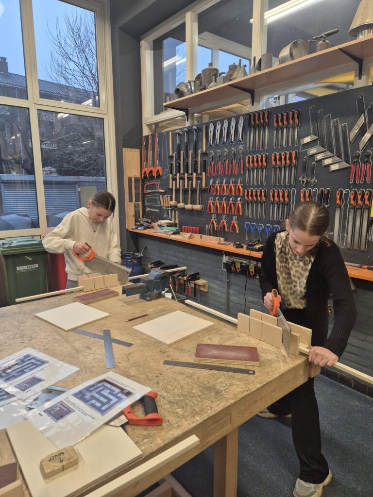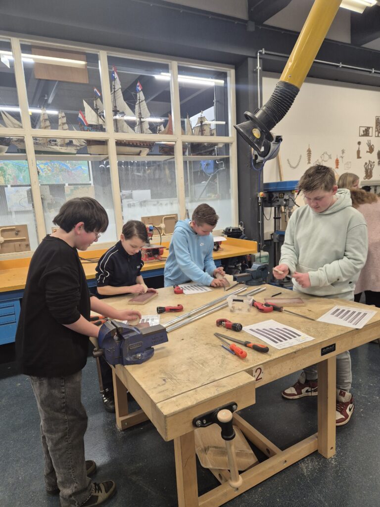De workshop van afgelopen week stond in het teken van werken met onze handen. Na een korte rondleiding door de gangen van het Technisch College kwamen we terecht in een mooi lokaal vol werkbanken. Na een introductie, uitleg over de school en het stellen van vragen, mochten de leerlingen zelf aan de slag. De ene helft van de klas maakte een eigen knikkerbaan, terwijl de andere helft druk bezig was met het maken van een windgong. Er werd ontzettend hard en geconcentreerd gewerkt. Dat was ook nodig, want zagen, vijlen, schuren en boren doen we niet elke dag! Het eindresultaat mag er dan ook zeker zijn; iedereen kan trots zijn op wat hij of zij heeft gemaakt.