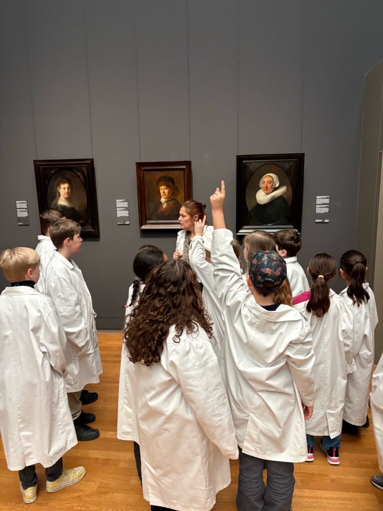 We werden verdeeld in kleine groepjes en kregen een rondleiding door het museum. Geen verhaal waarbij je alleen maar hoeft te luisteren, maar een rondleiding waarbij de kinderen steeds werden uitgedaagd om goed te kijken. Wat zie je eigenlijk op een schilderij? Waar gaat je oog als eerste naartoe? En waarom zou de schilder dat zo hebben gedaan? Bij sommige werken werd er heel serieus nagedacht, bij andere juist enthousiast gespeculeerd. Vooral bij de schilderijen van Rembrandt leverde dat mooie gesprekken op.